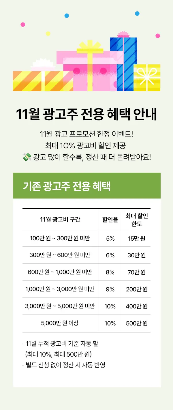 11월 누적 광고비 기준 자동 할인 (최대 10%, 최대 500만 원)