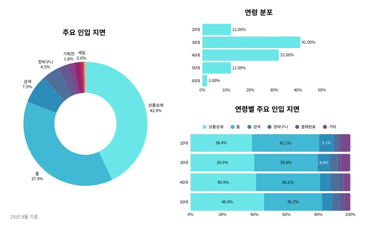 20대 (12%)→ 홈 중심의 유입이 많아 신상품·브랜딩 광고 타깃으로 성장 가능성 큼.