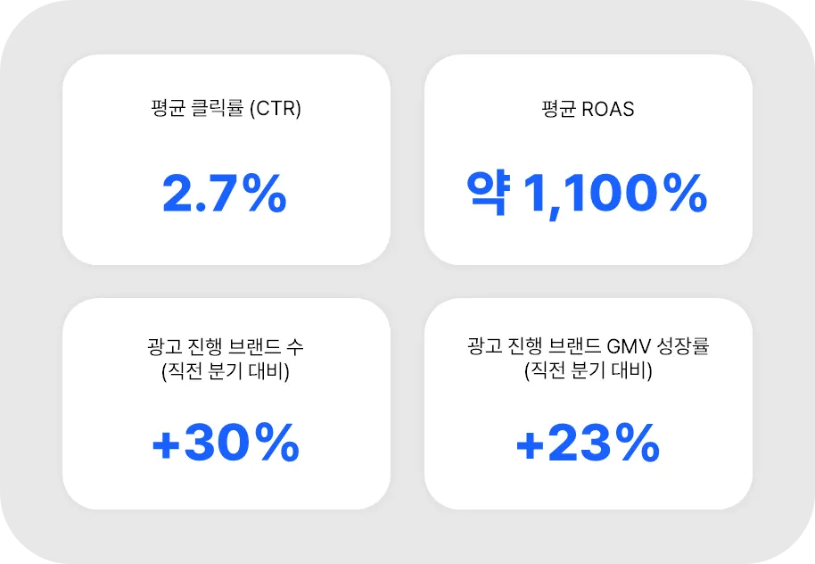 광고 도입 브랜드 수는 꾸준히 증가했고, 광고 집행 브랜드의 GMV 역시 동반 상승하며, 광고가 실질적인 매출 성장으로 이어지고 있음을 확인할 수 있었습니다.