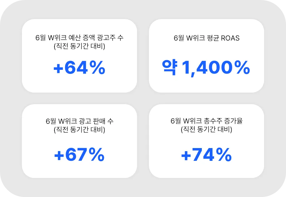 특히 6월 1일부터 6월 15일까지 집중 운영된 더블유위크 기간은 광고 효율이 비약적으로 향상된 시기로, 광고 활성화와 매출 견인 효과를 동시에 이끌어낸 대표적인 캠페인 기간이었습니다.